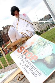七月十四日,渥太华和蒙特利尔法轮功学员在国会山通过模拟酷刑展、图片展和功法展示等形式抗议中共发动的长达八年对法轮功学员的迫害。