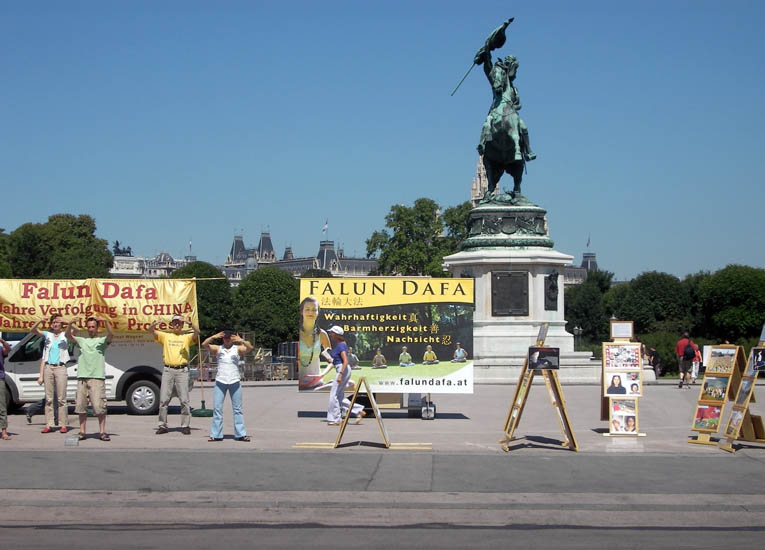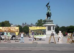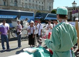 法轮功真相图片展也引起了人们的关注。很多来自中国大陆的旅游团经过这里。一群来自中国的学生,都被眼前的模拟酷刑展惊呆了。他们默默的看着,露出震惊的表情,一些学生接过了法轮功真相资料。