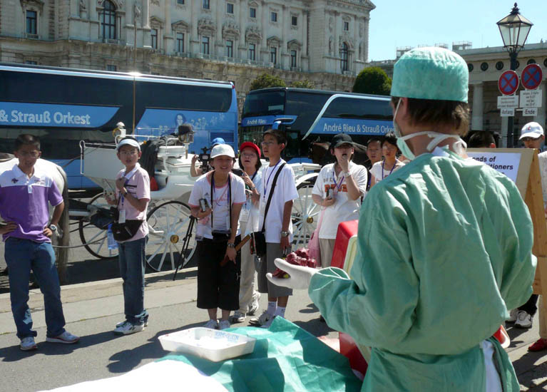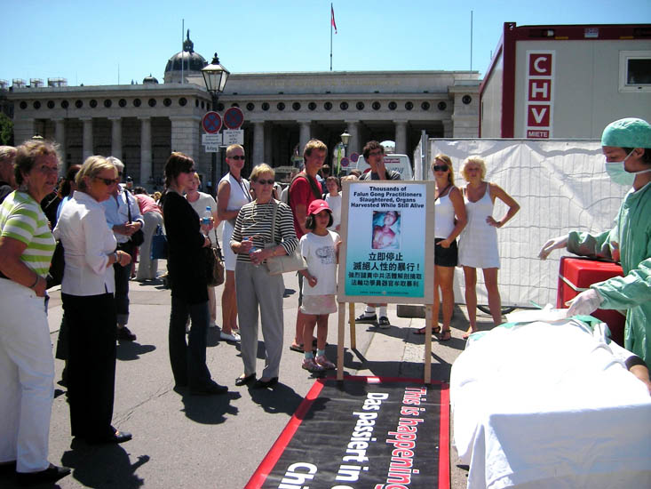 揭露中共活体摘取法轮功学员器官的模拟展示引来了很多民众观看。人们对中共如此残暴的兽行表示愤慨,都纷纷在反迫害征签表上签字。