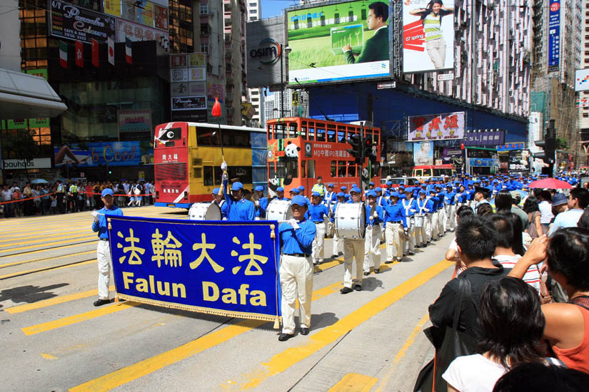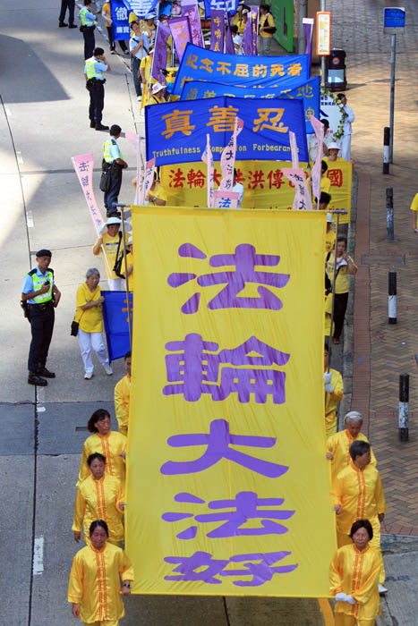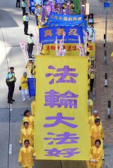 ![]() 香港法轮功学员“解体中共 结束迫害”游行队伍,由天国乐团开路,由铜锣湾维多利亚公园出发,经过繁华街道,到达中联办前。 |