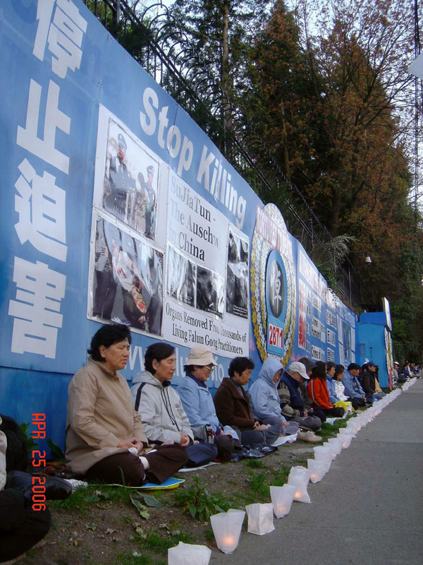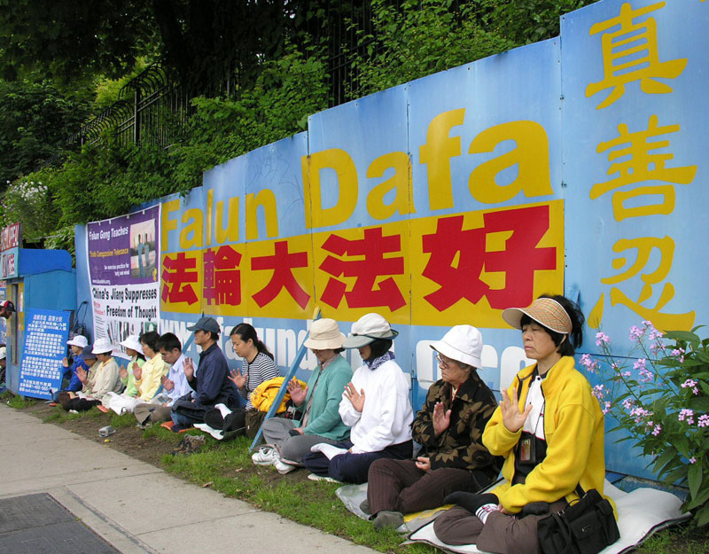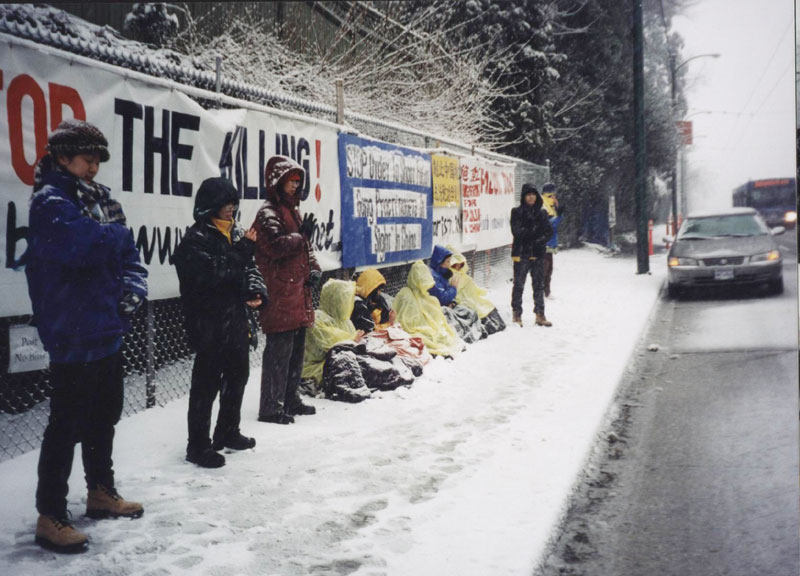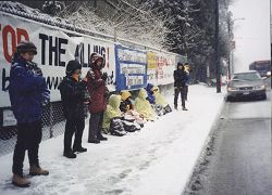 温哥华的法轮功学员轮流在这里进行每天二十四小时静坐的和平抗议活动。他们中有古稀老人、孕妇,也有刚刚下班就赶来、或守了一夜又赶去上班的公司职员。日复一日、年复一年,至今已持续近六年。二千一百多个日日夜夜,不论严寒酷暑,冰天雪地或大雨倾盆,他们从未间断。