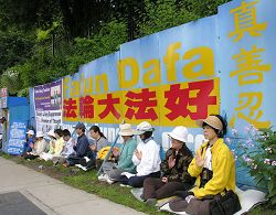 固兰湖街是温哥华市的交通要道,车流量很大,中领馆前白天单向车流量每小时约一千二百辆。不时有过路的车辆鸣笛,司机伸出大拇指,有的大型旅游车特意靠近展板前驶过,车上的游客向抗议者招手。这里俨然是一处了解法轮大法真相的景观,是温哥华一道独特的风景线。