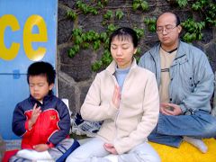 邓女士的丈夫LEO最初反对妻子参加静坐抗议,后来自己也开始修炼法轮功,还全家一起在中领馆前抗议,六岁的儿子宗宗跟着大人一本正经的盘腿立掌。