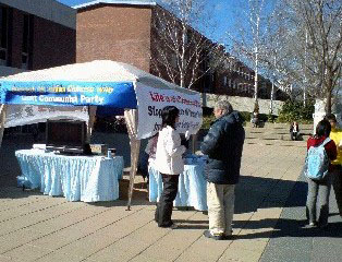 ![]() 服务义工向中国留学生介绍退!党!活动 |