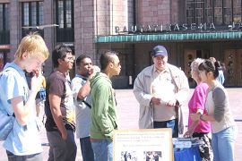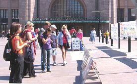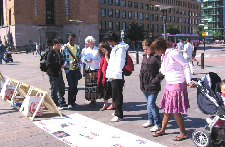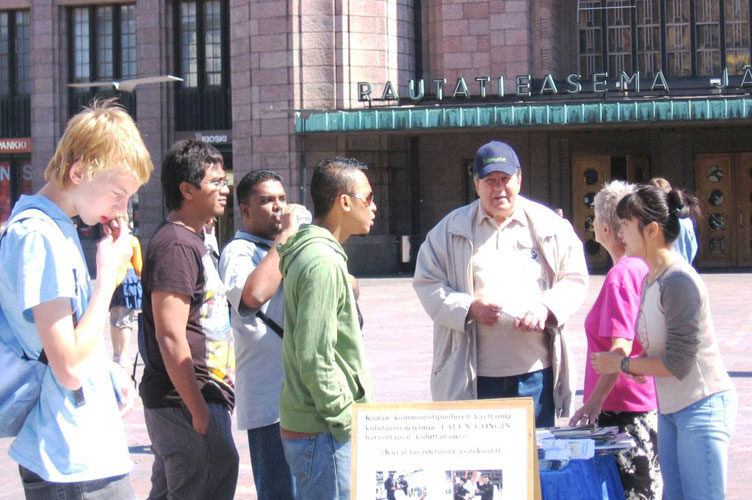 大.纪.元;义工姜女士说,一位八六到八八年在北京住过三年半的芬兰男士用中文向她问好,接着说他从网络上知道法轮功在中国遭迫害的情况。当她送一份英文的“·九·评*”给这位先生时,他高兴的说,他今天得到了一份好东西。