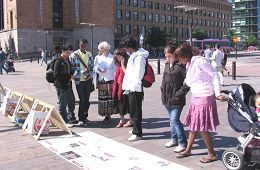 一位身材魁梧的男士在展板前看了许久后对Anija说:我相信这场(对法轮功的)迫害马上就会停止。
