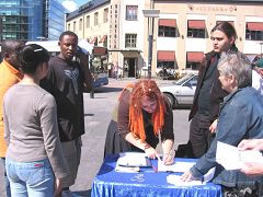 一直站在征签桌旁的芬兰法轮功学员Anija说:今天来签名声援退出中共的人们很踊跃,而且反响很大。
