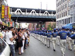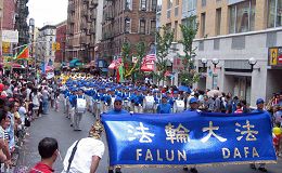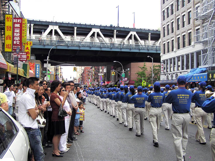 百人以上的天国乐队开道。身着蓝色上装的天国乐手们精神高昂,在唐人街热情的夹道欢迎中,演奏着一首又一首曲目:《法轮大法好》、《法鼓法号震十方》、《法正乾坤》、《美丽的美利坚》和《送宝》。天国乐队成员时先生表示,新曲目《送宝》是专为这次游行所准备,希望通过我们的演奏给中国城的民众送上最宝贵的福份。