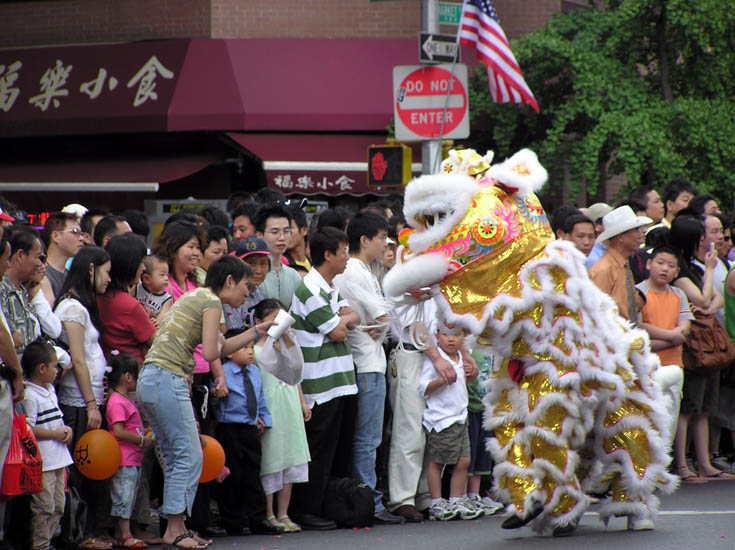 这次游行警方没有在路的两边放栏杆,有些地方,观看游行的人潮几乎就是贴着游行队伍,大家似为一体,欢乐融融。法轮功队伍一如既往,有多个庞大方阵,绵延一条多街。