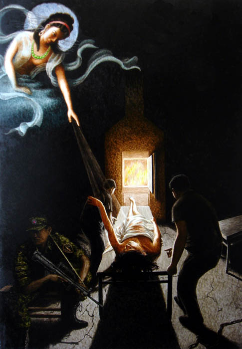 创作说明:画面主体是一位女大法弟子刚刚被解剖,身体的器官已经被摘除,昏迷中要将她投入炼人炉的恐怖场面。这时,一位菩萨赶来迎接这位女弟子,女弟子苏醒过来,痛苦中手伸向菩萨……身边的罪恶的执行者们并不关心人的死活,麻木中继续着罪恶的行为。手握着枪的看守士兵似乎已经完全习惯了这种罪恶,说明着中共邪*党-用魔性代替人性。