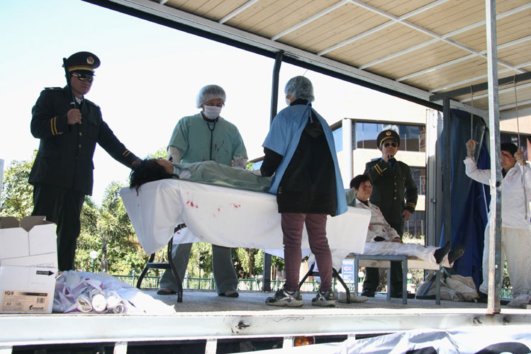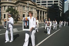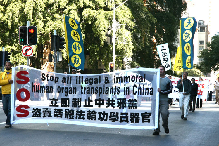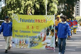 游行队伍在警车的护卫下,从市中心行至中国城。沿途很多市民驻足观看、拍照,阅读传单,认真听着扩音器传出的真相广播。游行中揭露中共酷刑迫害法轮功学员甚至活体摘取盗卖法轮功学员器官的模拟展示震惊着人们。