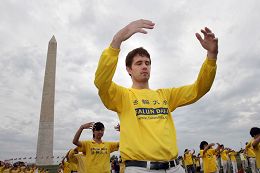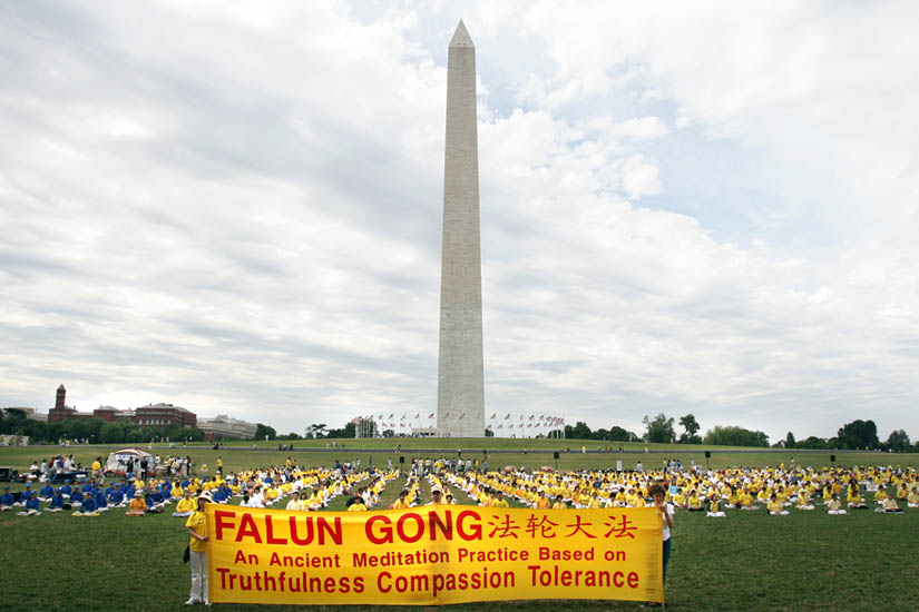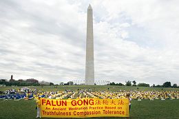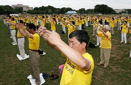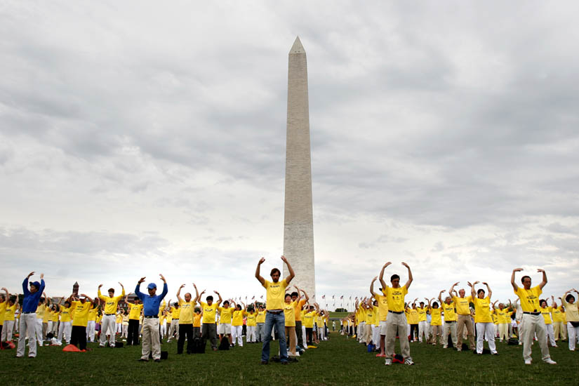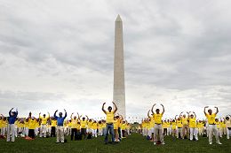 “七•二零”之际,来自欧、美、亚洲等部份法轮功学员在美国首都的华盛顿纪念碑北广场晨炼,展示法轮功的美好,并呼吁制止迫害。