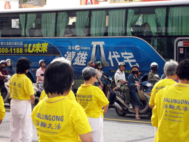 ![]() 法轮功学员在中港路两旁表演功法,许多路过的机车骑士及巴士上的民众观看 |