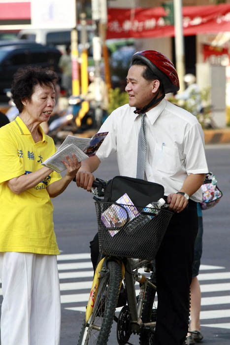 正在跟法轮功学员聊天的中港路商家「乾隆坊」的施经理说,在报上看过关于法轮功的报导,知道这功法不错,因为炼功使身体变的很好,性情也会比较好。他曾在文化中心、公园看过有人在炼,在炼功时大家都很安静,每一个人脸上都很慈祥。施经理同时说到,法轮功在中国大陆受到的打压,他在《大.纪.元;时报》和电视里都曾看过报导。