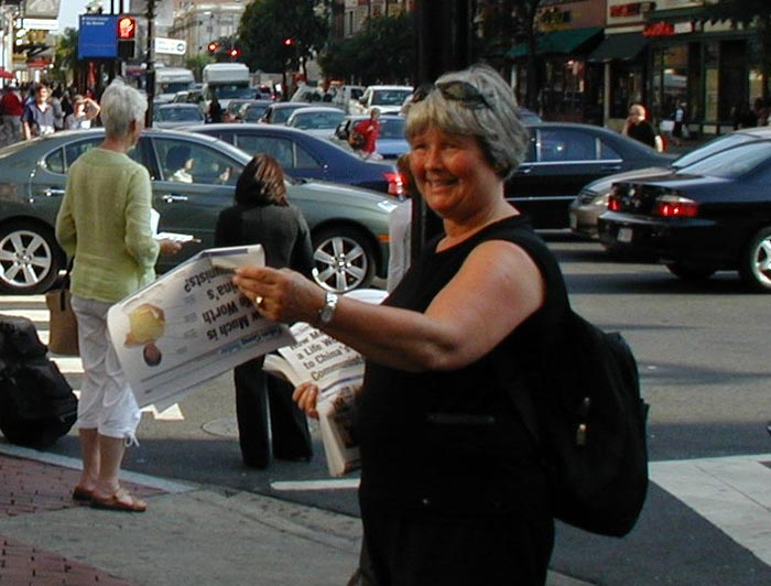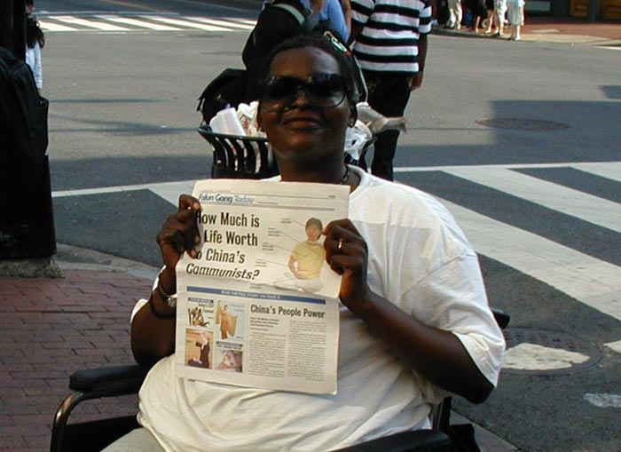 从美国夏威夷来的郑女士看上去已经不年轻了,她一个人在街头派发资料,希望唐人街的华人能从她手中的报纸中获得真实的信息,也希望能跟他们交谈。她在中共迫害法轮功之前就得法了,加上今年已经是第四次来华盛顿参加“七•二”零的抗议活动了。她认为华盛顿是讲真相很好的地方,它是首都和国会所在地,也是议员和政府工作人员集中的地方,在这里讲清真相,可以引起很多人的关注,更好的帮助中国国内的法轮功学员,制止中共的迫害。