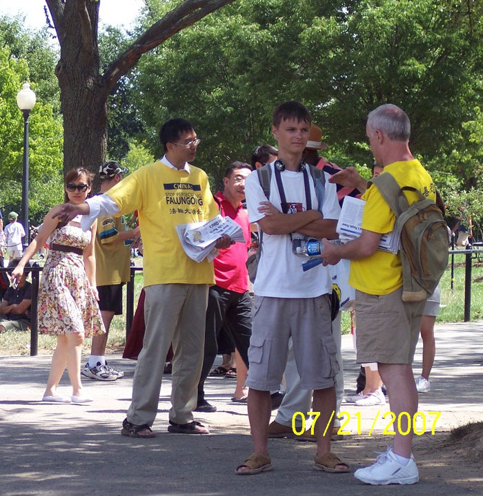 一位在现场发资料的学员表示,今年感觉最大的变化是华人。林肯纪念堂每天不知有多少中国人来来往往,今天越来越多的华人表达了愿意了解真相的愿望,他们观看横幅、表演,并露出友好的微笑。