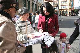 一位来自法国的游客,在悉尼中国城了解到法轮功受迫害真相后,非常认真的在征签簿上写下了自己的姓名,地址。当记者问她为什么要这么做时,她说:“因为我知道了法轮功受迫害的真相,我完全理解发生了什么,所以我要帮助法轮功制止这场迫害。这是我希望做到的事情,也是我能够做到的事情。”