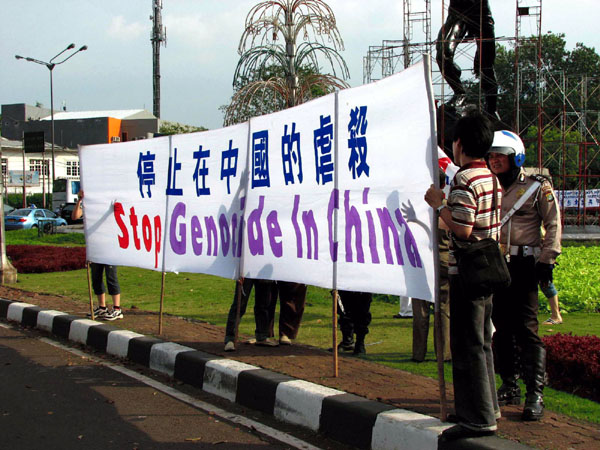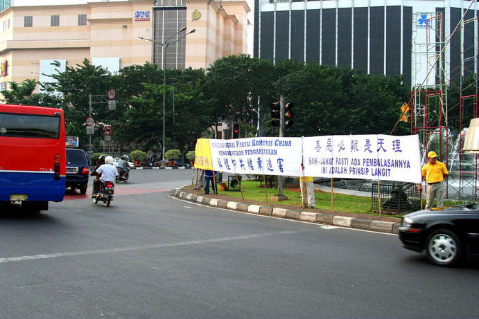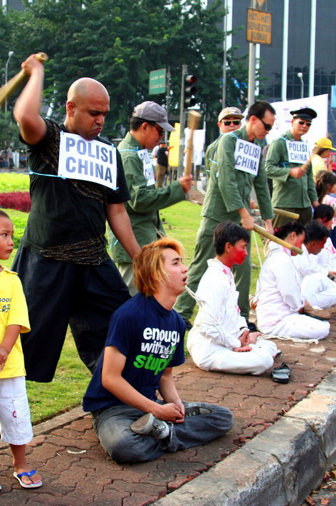 反酷刑展上的“中共警察”和印尼警察形成善恶鲜明的对比,“中共警察”正挥舞棍棒,“凶狠”的向法轮功学员“行恶”,而印尼警察正在维护着揭露“中共警察”制造迫害的展示场所。