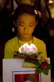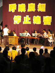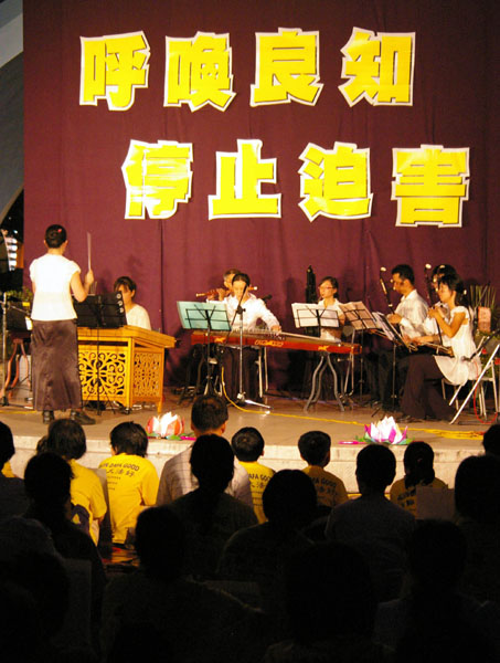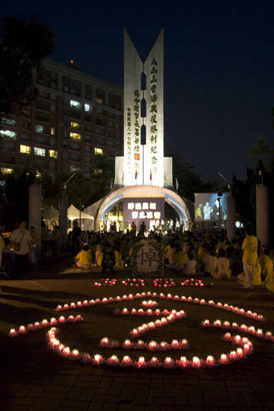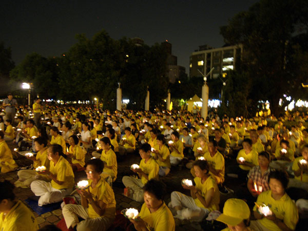 晚间六点五十分,一千六百多名法轮功学员涌入台北中和八二三纪念公园,以音乐和歌声悼念这八年来,在中国大陆遭中共迫害致死的同修。舞台上一首首呼唤正义良知的歌曲将邪恶湮灭,舞台下一盏盏传递真诚善良的烛光把黑暗照亮!学员们盘腿坐在广场上,举起手中的莲花灯,捧着被迫害致死的法轮功学员的照片,静默端坐,庄严圣洁。