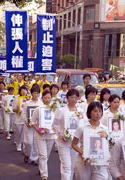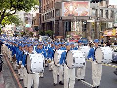 夏日午后,气温异常炎热,但大法弟子终止迫害的决心始终不移,游行队伍的人数持续增加、已达上千人。游行队伍由三位身着蓝衣的女学员手持「法轮大法」的横幅走在前面,紧随其后的是由二百多名法轮功学员以庞大阵容所组成的「天国乐团」军乐队。