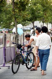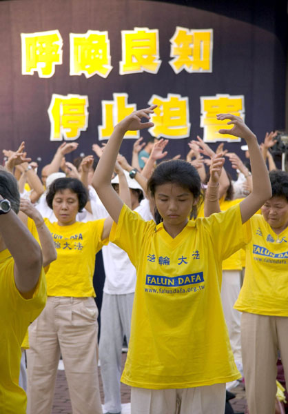 在游行队伍行进的同时,一群法轮功学员也于下午四点二十分,在中和公园八二三纪念碑广场上,展示五套功法。人声鼎沸的周末街头,学员们祥和、平静的面容为人们浮躁的心灵注入一股慈祥与安宁。