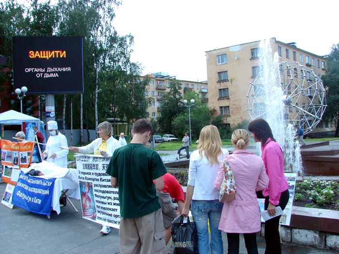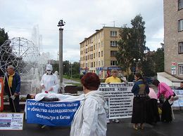 在靠近芬兰的西北城市彼得罗扎沃特斯克,法轮功学员以真人模拟的形式,揭露中共活体摘取法轮功学员器官牟取暴利的暴行。高加索矿泉旅游疗养区的法轮功学员则聚集在该区的皮基高尔斯克市,向来自国内外的游客讲清真相。