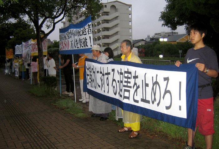 参加集会的法轮功学员整齐地站一排,手举横幅;许多过往车辆和行路人停下观看。有的人还特意从车里向学员们招手,并高喊:“停止迫害”,以示支持。