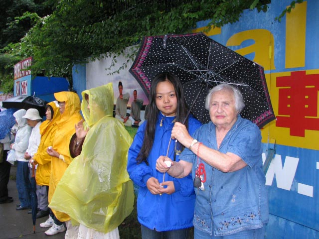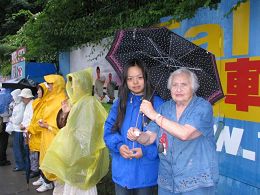 加拿大前国会议员西玛•霍特(Simma Holt)到现场和法轮功学员在雨中共同悼念八年来被中共迫害致死的法轮功学员。