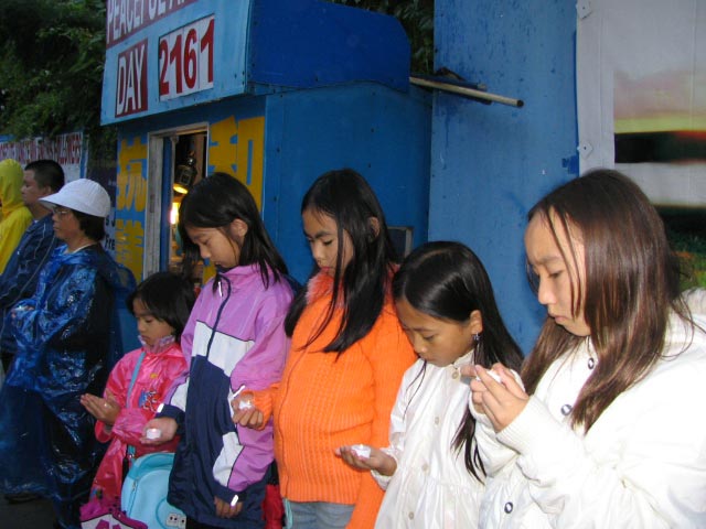 当天,不少老人和孩子也参加了烛光悼念。其中小弟子婷婷是一九九九年出 生,七个月大就开始随着母亲高女士,与三岁的姐姐到处去讲真相和参加各种和平抗议中共迫害的活动。高女士说:“八年了,当年的婴儿现在已是小学生了。两个孩子与我一道见证了海外法轮功学员呼唤正义这段历史。”