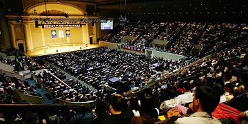 师尊的亲临引起全场掌声雷动。弟子们听法后,对救度众生的责任和使命有了更深的领悟。法轮功学员四千多人有幸在场聆听了师尊的这次讲法。
