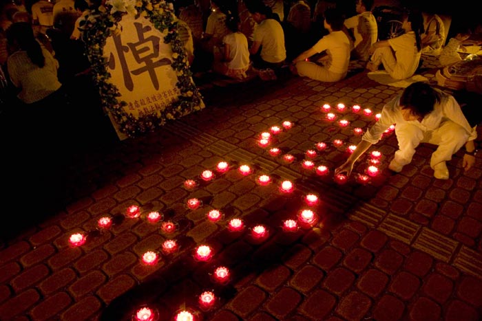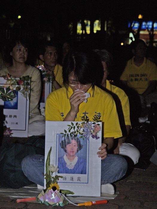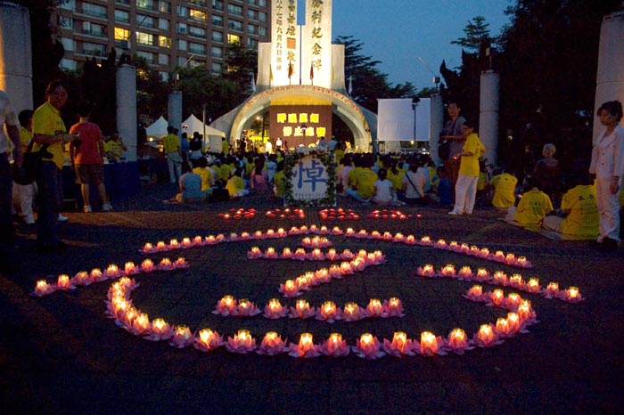 一千多名法轮功学员在四号公园的广场上席地而坐,人手一盏莲花型花灯或萤光棒,开始烛光悼念音乐会,现场望上去有如一片莲花灯海。台北在世界地图上小到几乎看不到,但这里却有一千多颗真心,心系千里之外的迫害。