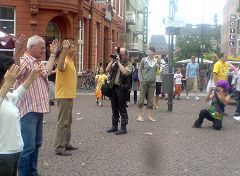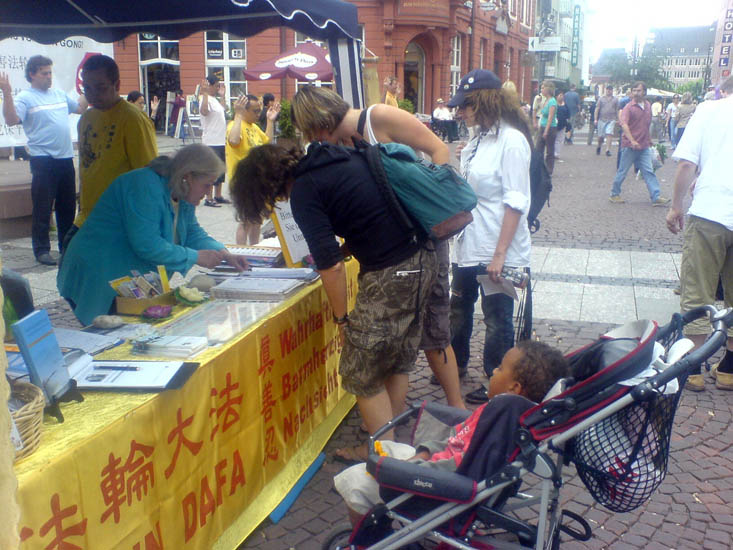 午后,人流越来越密集。有的驻足和法轮功学员攀谈;有的为祥和的炼功场面拍照和录像。得知炼功学员前面排放的照片都是在迫害中失去生命的大陆法轮功学员后,许多德国人默默的注视着照片上学员的面容;明白真相后的许多人们主动要求签名反迫害,大量市民接过学员散发的传单。