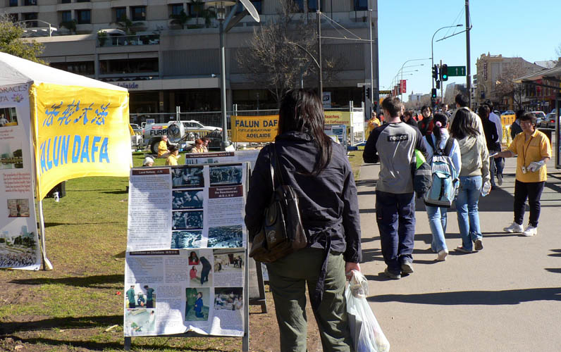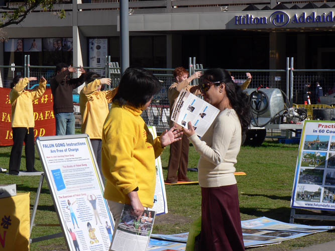 学员们在广场集体炼功,当人们知道这是法轮功时,许多人表示要学法轮功并索取当地炼功地点详细的资料,还有人当场学习法轮功。人们表示出对大法的渴望。当看到中共残酷迫害法轮功学员的图片时,人们惊讶、沉痛而后谴责中共的暴行。