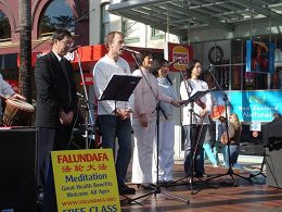由法轮功学员们组成的合唱团演唱自创歌曲,揭露迫害