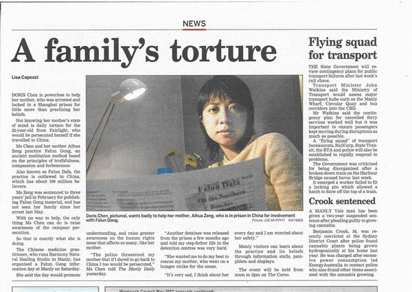 文中说到:“多瑞斯和她的妈妈曾爱华都修炼法轮功,一种以‘真善忍’为原则的古老修炼方法,也称法轮大法。法轮大法约有一亿修炼者,但在中国被(中共)定为非法。曾女士在今年二月份因印制法轮功资料而被判刑三年。‘警方威胁我母亲说,如果我敢回到中国,也同样会受到迫害。看守所的生活十分艰难,我妈妈曾绝食抗议。我很难过,我每天都想念妈妈,并为她的安全担忧。’多瑞斯没有其它方法帮助母亲,她能做的就是让人们注意到这场蔓延着的迫害。这也正是她目前在做的事情。她说,这个大法信息日将促进人们对法轮功的了解,让人们更多关注影响了象她母亲这样的许多人的人权问题。”