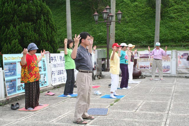 ![]() 在故宫讲真相的法轮功学员炼第二套功法──法轮桩法 |