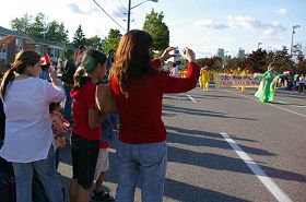 ![]() 看着法轮功队伍远远走来,观众们兴奋的拍照留念 |