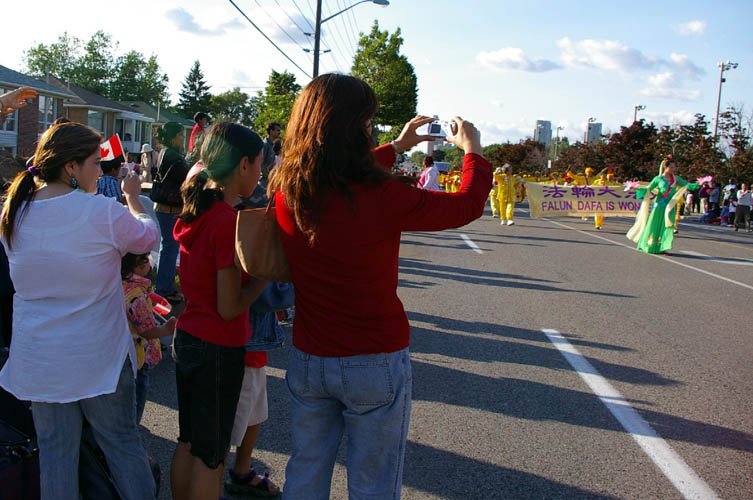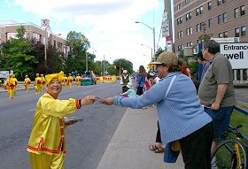 法轮功学员Doris刘对记者说,在上午的东约克游行,她在沿途发真相资料时遇见一位来自中国大陆的女士,带着五岁的儿子在观看游行,当看到法轮功的队伍过来时,她赞叹的对Doris说:“你们法轮功的队伍真是太美了,一定炼了很久了吧!”