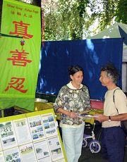 迪安娜从来没有听说过法轮功,可是在信息摊位看到法轮功的信息后,她就主动询问学炼法轮功的方法。学员告诉她,学炼法轮功是免费的,可以到当地的炼功点学炼,也可以当场为她演示五套功法。听后,她当即认真的将一至五套功法从头至尾学炼了一遍。