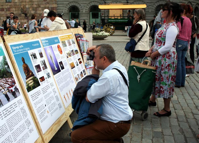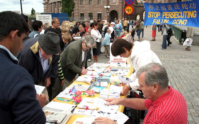 七月二十八日至二十九日,法轮功学员借世界帆船比赛这个机会在斯德哥尔摩市中心广场上挂起“停止迫害法轮功”的横幅,摆放介绍大法洪传世界和法轮功学员在中国无辜遭受中共迫害的展板,向来自世界各地的游客发放不同语种的真相资料,同时演示五套功法。优美的音乐、舒缓祥和的功法演示吸引了众多游客,人们驻足观看并询问更多的信息。法轮功学员耐心的与人们交谈,从中共对法轮功的迫害,讲到中共劳教所内活体摘取法轮功学员人体器官的黑幕;从中共的邪恶本质,讲到善良的人们呼吁制止这场迫害的必要。人们纷纷签名,谴责中共的恶行。一位男士对法轮功学员说:“活体摘取人体器官,这样残暴的事情中共能干的出来的,这是它的本质决定的。你们做的对!就是要让更多的人认清中共的邪恶本质,我支持你们!”
