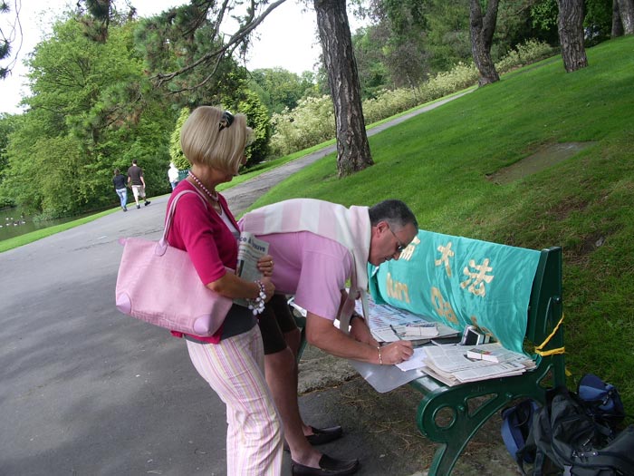 【明慧网二零零七年七月三十一日】我是法国北部的一位大法弟子,为了让这里的众生了解大法,了解真相,我决定每周六、周日、周三在Parc Barbieux 炼功,并向世人讲清迫害真相。