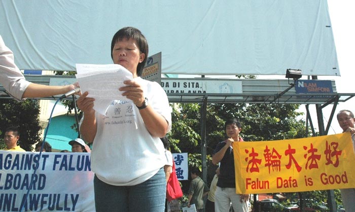 ![]() 法轮功发言人陈女士在广告牌现场召开的新闻发布会上,呼吁马国政府关注此事,注意中共对马国的渗透 |