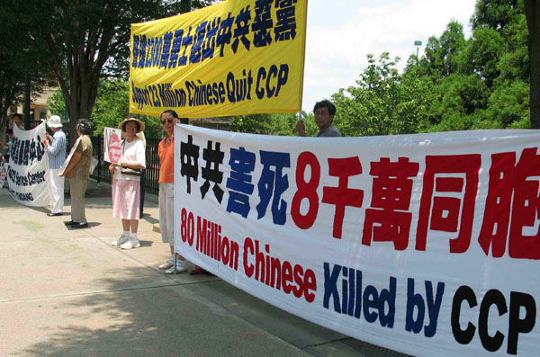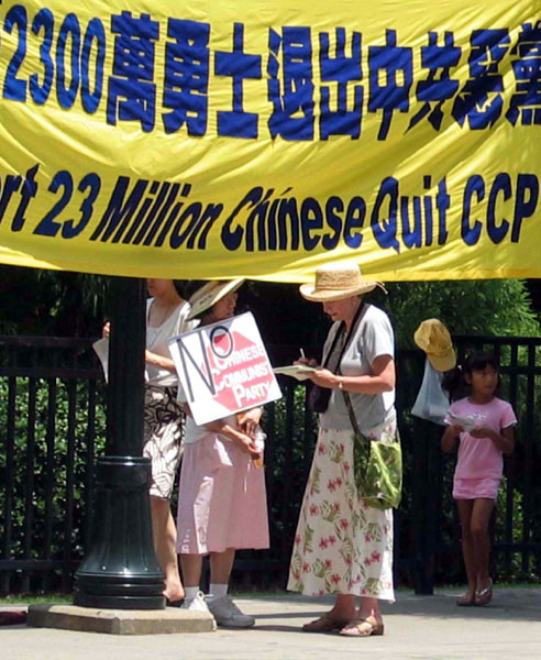 现场挂起了“全球.退:党!解体中共月——退!党!是解体中共的步伐”、“声援二千三百万勇士退出中共”、“中共害死八千万同胞”、“不当中共的殉葬品”、“中共邪灵的根都拔出来了——你还在等什么?”等横幅,吸引许多休闲和旅游者驻足观看。