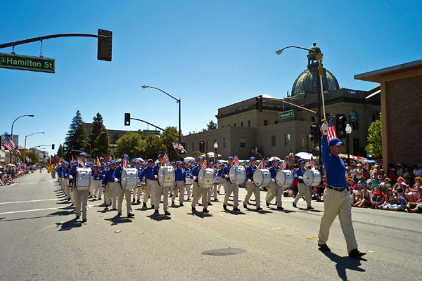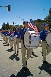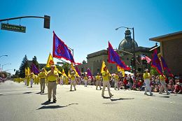 据法轮功学员张女士介绍说,法轮功的队伍有三个方阵,由二百五十人组成。第一个方阵的是美西天国乐团,这是天国乐团首次参加红木城游行。紧接着天国乐团的是旗队,最后的是法轮功炼功队。这是法轮功学员连续第六年参加红木城游行。一路上,两旁的观众看到学员的精彩演出不断的喝彩。