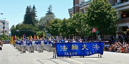 游行路线设有多个队伍介绍台,其中一位主持人表示,法轮功是此次游行中最壮观的队伍。另一位则说,他们的炼功队伍很整齐。主持人介绍,由上百名法轮功学员组成的天国乐团成员来自社会各阶层,他们中有博士、家庭主妇、硅谷工程师、部门经理、学生等,主持人说:“法轮功不愿落下任何人。”