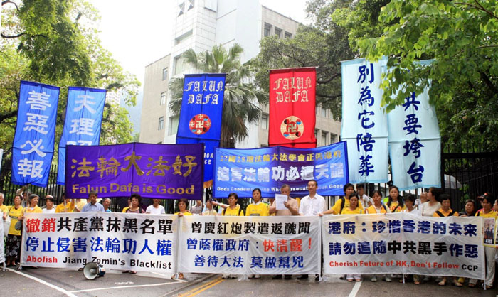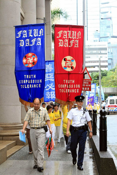 新闻发布会之后,法轮功学员游行至政府总部,向曾荫权递交公开信;警方代表接过公开信后,学员和平离去。