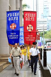 ![]() 法轮功学员持旗幡和抗议横额经立法会大楼和汇丰银行总行,到政府总部抗议中共施压要港府暴力遣返法轮功学员 |