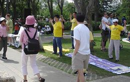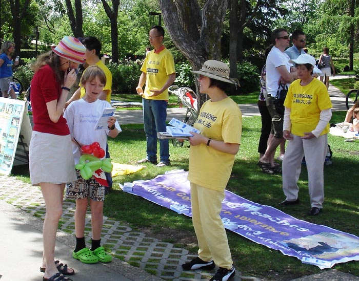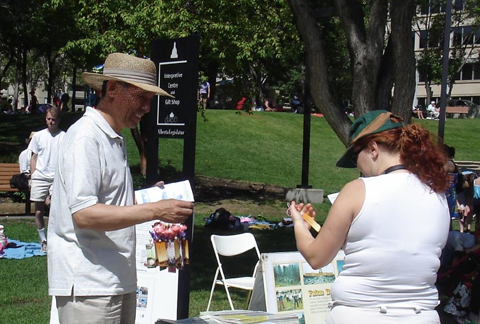 【明慧网二零零七年七月六日】二零零七年七月一日是加拿大一百四十周年国庆,在埃德蒙顿市省议会大厦前的广场上,游人如织。法轮功学员以图片、小莲花、现场功法演示、发资料等形式向人们展示法轮大法的祥和美好,让人们直观的了解法轮大法和目前发生在中国的