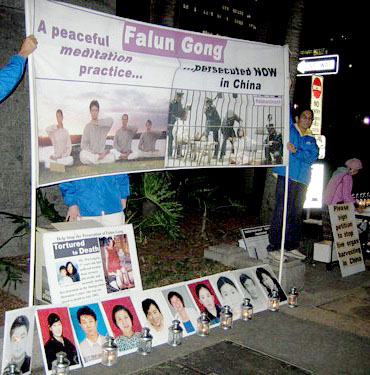 一盏盏烛光在一幅幅遭迫害致死的法轮功学员的遗像前点燃,来往的行人被这景象吸引住,停下脚步询问学员“发生了什么事?”