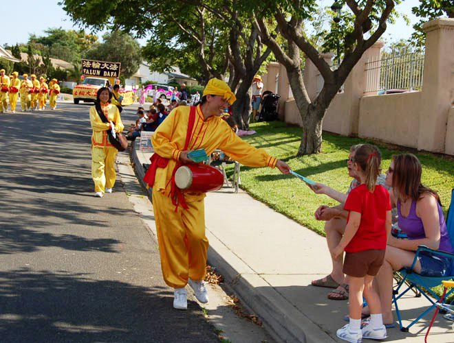 队伍所到之处,受到街道两旁观众的热烈欢迎。沿途不停的有人询问,“什么是法轮大法?”并急不可待的接过学员递上的法轮大法真相资料;不时有人还拦下发资料的学员,想立即了解更多的详情。数千份真相资料很快散发一空。